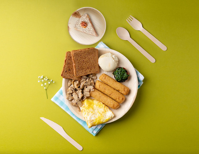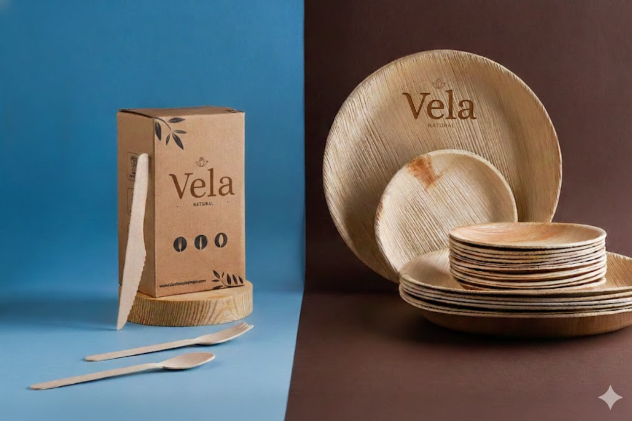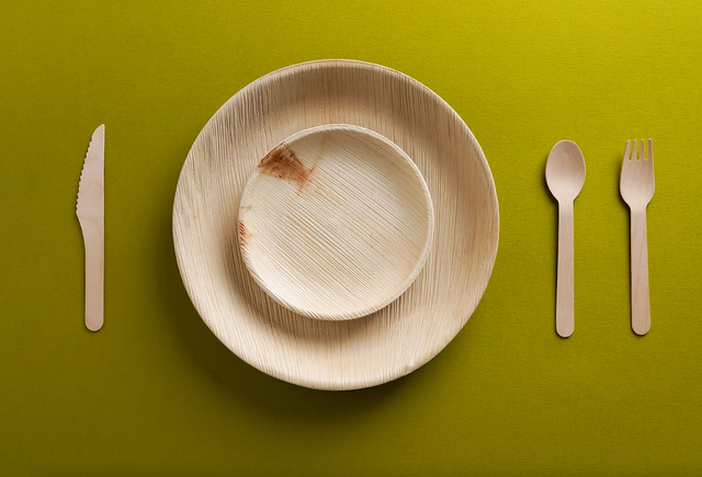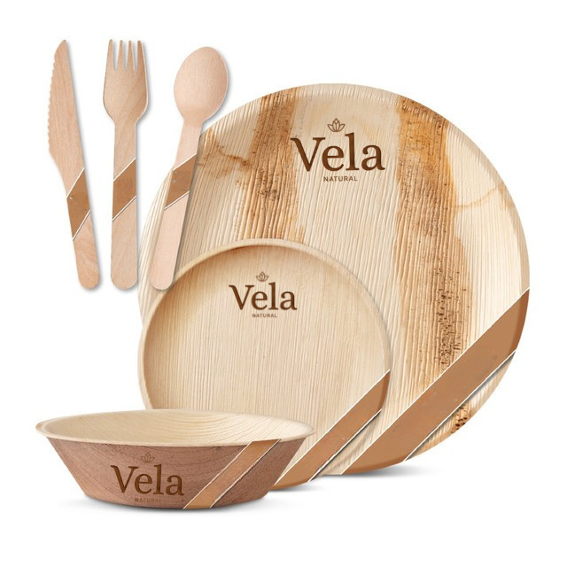 - Biodegradable palm leaf plates and bowls, Paper cups, Birch wood cutlery and Paper napkins