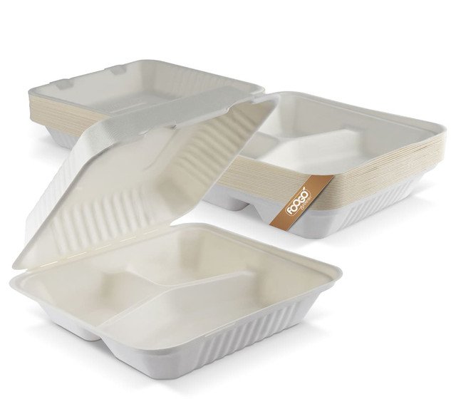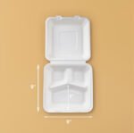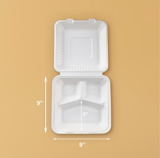 Our largest 3-compartment takeaway boxes are designed for substantial meals that demand variety and organization. With a massive 1300ml capacity, these 9”x9” clamshells feature three distinct sections to keep your main dish and two sides perfectly separated. Crafted from 100% renewable sugarcane bagasse, they offer the highest level of structural integrity for heavy, diverse menus without the environmental cost of plastic or Styrofoam.