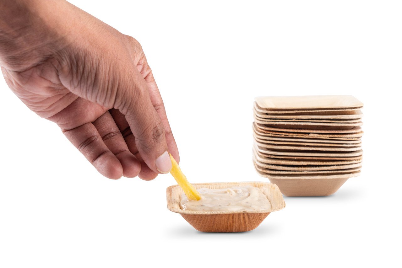 Our 3-inch (7.5 cm) Square Palm Leaf Dipping Bowls with a 50 ml capacity offer a compact, eco-friendly, and stylish way to serve sauces, chutneys, condiments, and tasting portions.